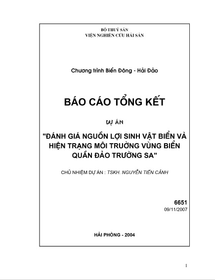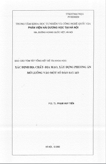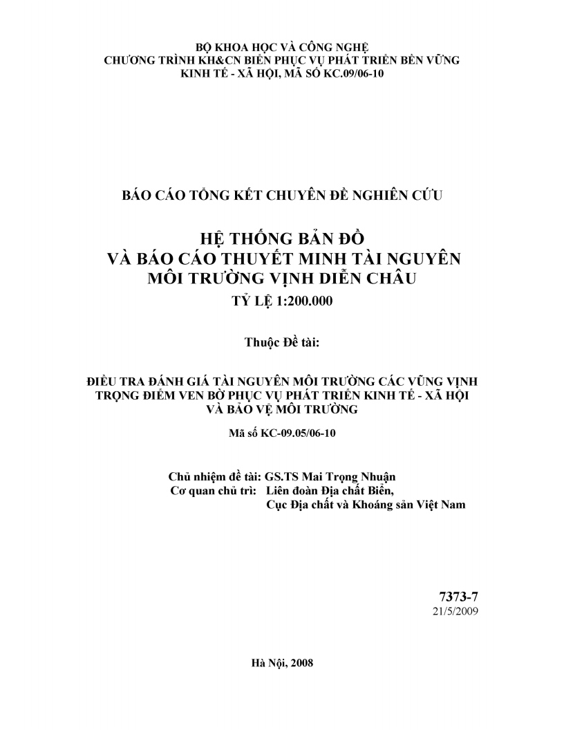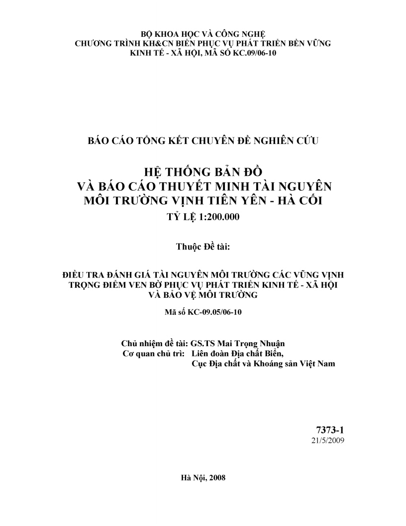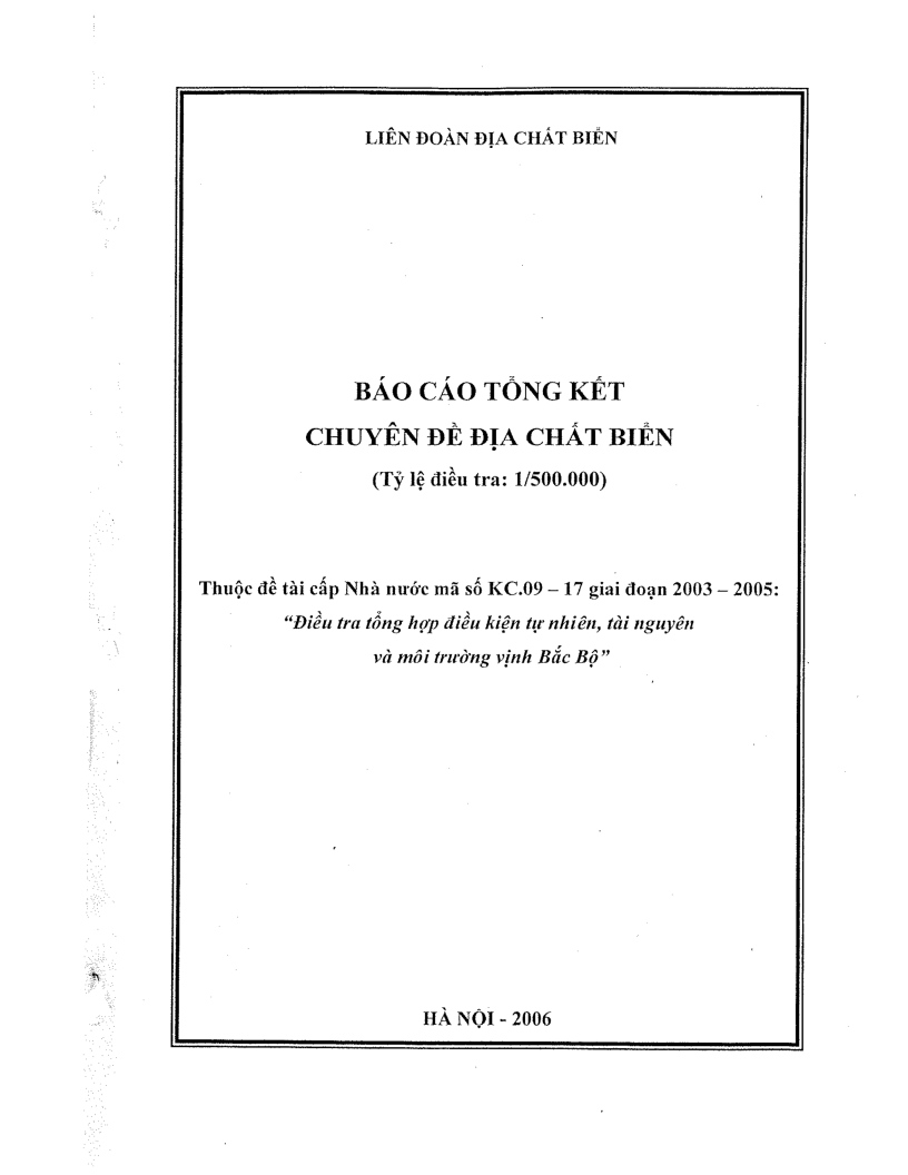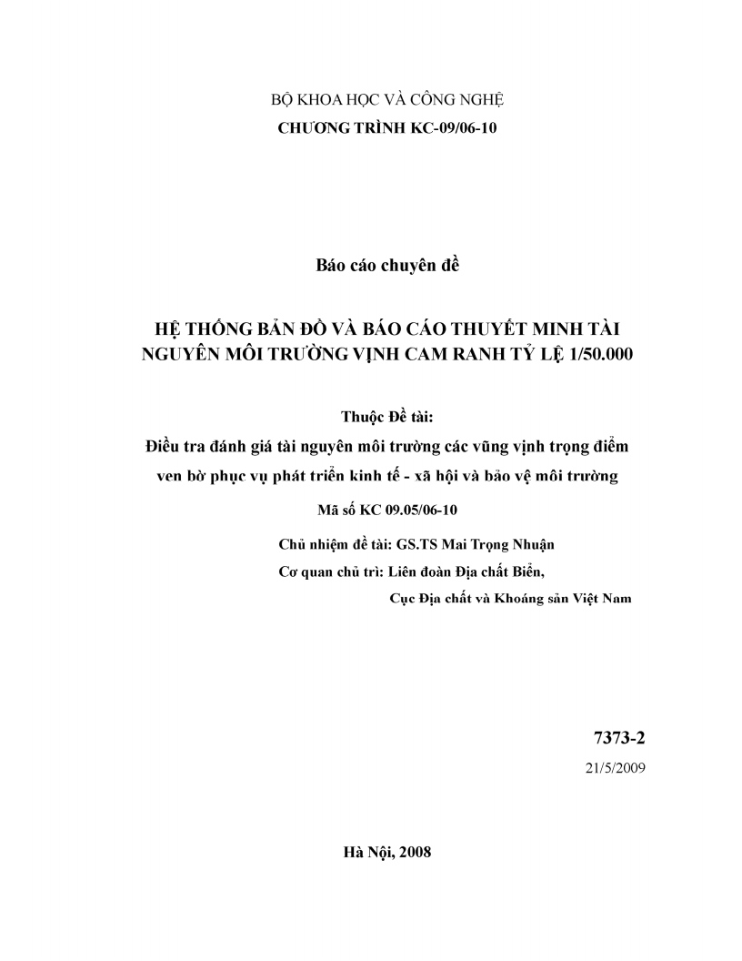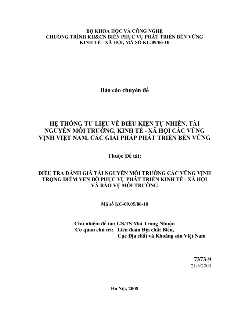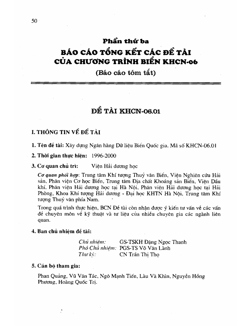 Tài liệu số là nội dung toàn văn của các báo cáo tổng kết, báo cáo chuyên đề thuộc các đề tài, dự án nghiên cứu biển trên các vùng biển và hải đảo Việt Nam từ trước đến nay. Người xem có thể đọc trực tiếp hoặc tải về toàn bộ nội dung của tài liệu.